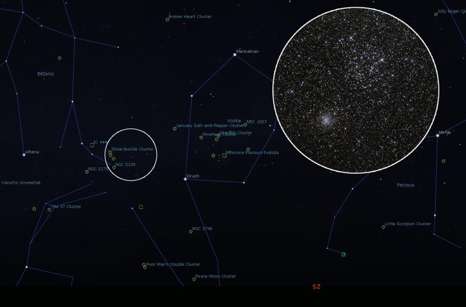 Majitelé dalekohledů si ale mohou udělat výlet za méně jasnými objekty zimního nebe. Pro pozorovatele s triedry se nabízí třeba hezká otevřená hvězdokupa M35 (NGC 2168) ze souhvězdí Blíženců, která je na hranici viditelnosti očima. V polovině 18. století ji nezávisle na sobě objevili dva astronomové: Švýcar Jean-Philippe Loys de Chéseaux si jí všiml již v roce 1745, během následujících pěti let ji však nejspíš zaregistroval také anglický lékař a přírodozpytec John Bevis. Objevuje se totiž v jeho hvězdném katalogu Uranographia Britannica z roku 1750.