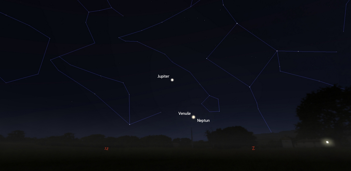 Blízké setkání Venuše a Neptunu v podvečer 15. února. Nedaleko této dvojice bude k vidění i Jupiter. (zdroj: Stellarium)