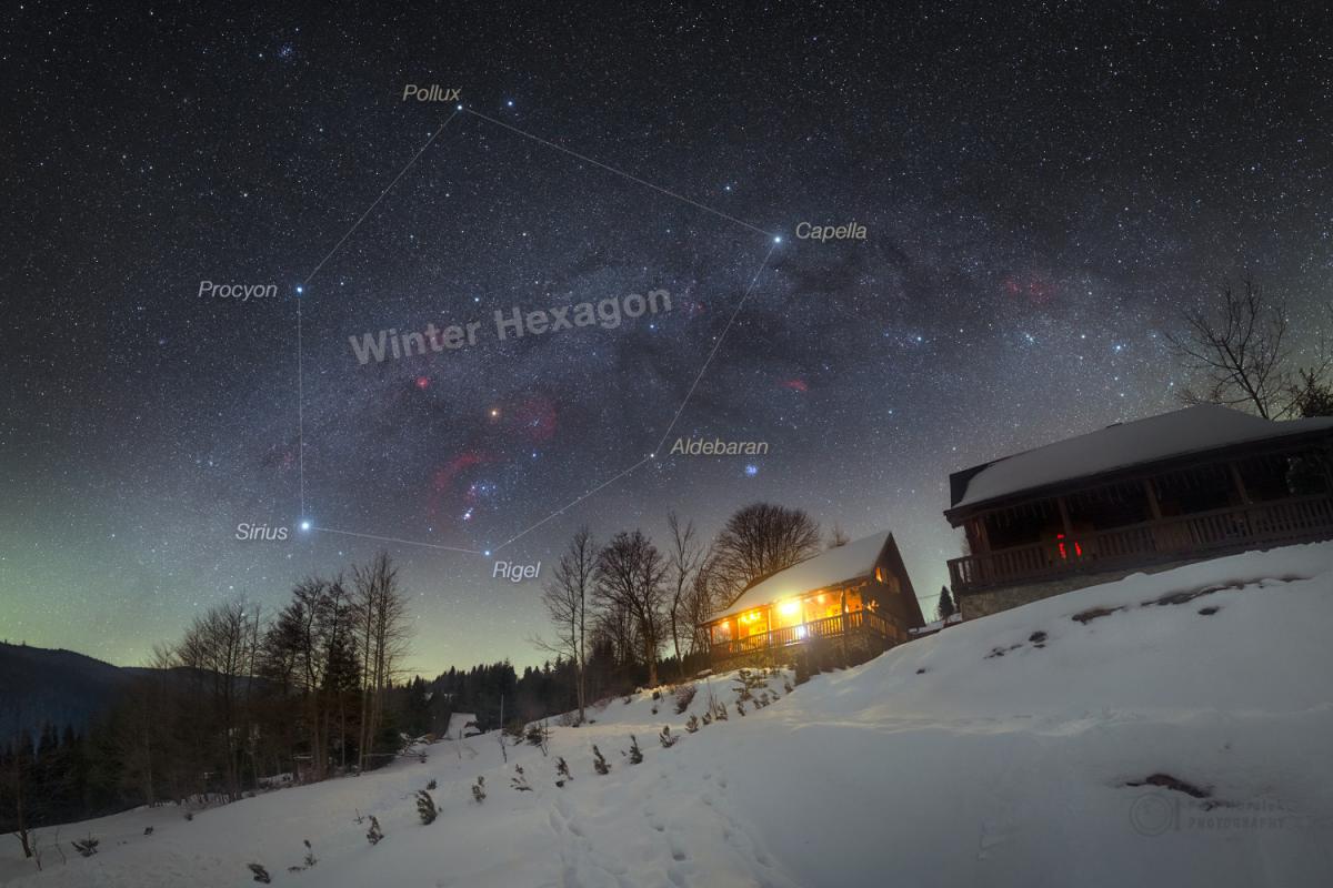 Noční obloha v zimě je mimořádně bohatá na jasné hvězdy. Většinu těch nejnápadnějších naleznete v tzv. zimním šestiúhelníku, jehož vrcholy vytyčují stálice Capella ze souhvězdí Vozky, Aldebaran z Býka, Rigel z Oriona, Sirius z Velkého psa, Procyon z Malého psa a Pollux z Blíženců. Uvnitř tohoto obrazce pak narazíte na dominantu Oriona, naoranžovělou hvězdu Betelgeuze.