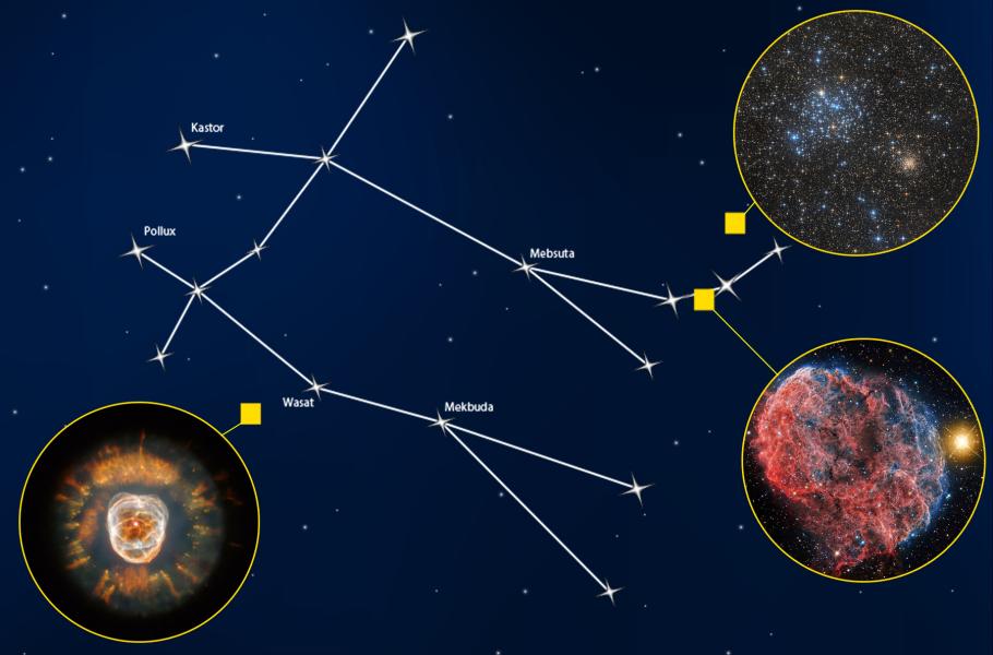 Už při pozorování amatérským dalekohledem je v souhvězdí Blíženců možné rozlišit několik zajímavých objektů.