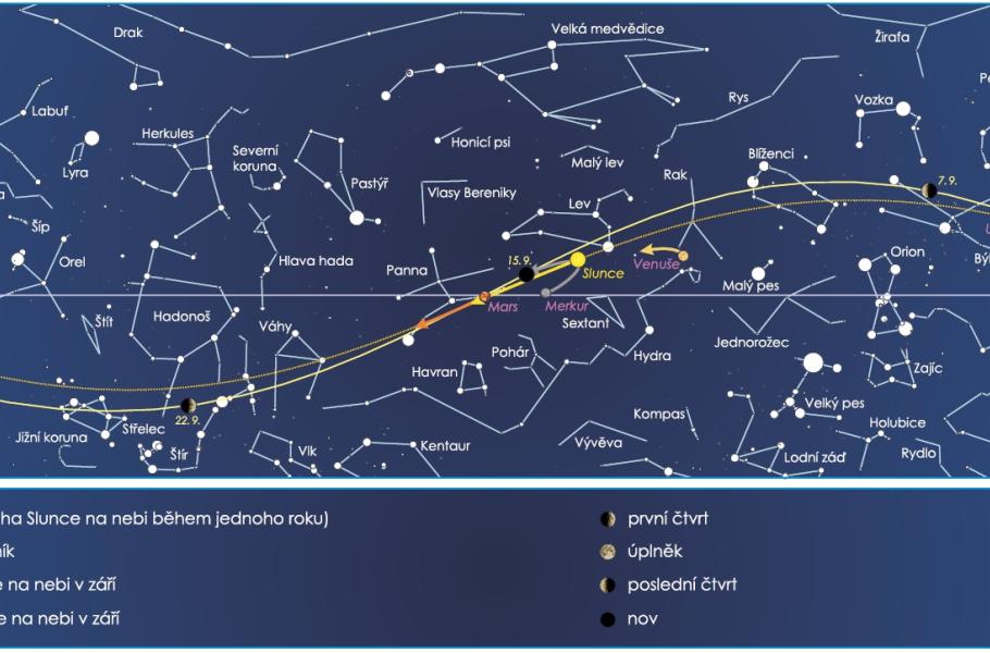 Jakmile se na počátku září začne stmívat, objeví se na noční obloze pětice nápadných stálic: Nad západem bude zářit Arcturus z Pastýře, zatímco nad jihem Vega z Lyry, Altair z Orla a Deneb z Labutě, jež tvoří vrcholy známého asterismu – Velkého letního trojúhelníku. Nízko nad severovýchodem pak zahlédnete Capellu z Vozky: Bude se silně mihotat, a nejspíš i hrát všemi barvami, s tím jak se bude její světlo nahodile lámat v hustých a neklidných přízemních vrstvách vzduchu.
