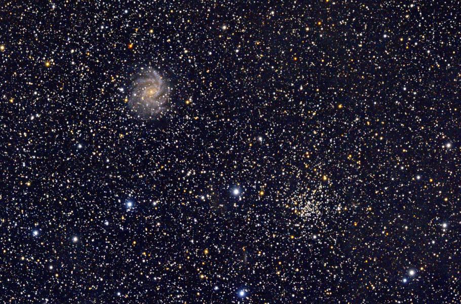 Otevřenou hvězdokupu NGC 6939 a spirální galaxii NGC 6946 dělí na obloze jen 39′, takže se vejdou do jednoho většího zorného pole. Pro začátek zkuste použít zvětšení zhruba 40×, s nímž obě snáz zaregistrujete oproti hvězdnému pozadí. (foto: Wikimedia Commons, Yu-Hang Kuo, CC BY-SA 2.0)