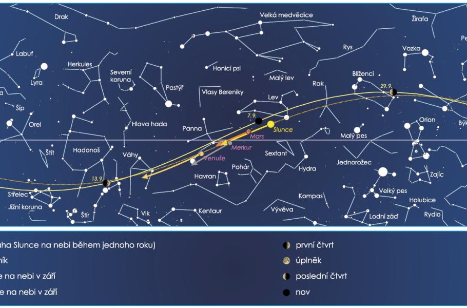 - 9. a 10. září – setkání velmi úzkého měsíčního srpku a Venuše na podvečerní obloze nízko nad jihozápadem (9. i 10. 9. cca 7°), níž nad obzorem viditelná také Spika z Panny