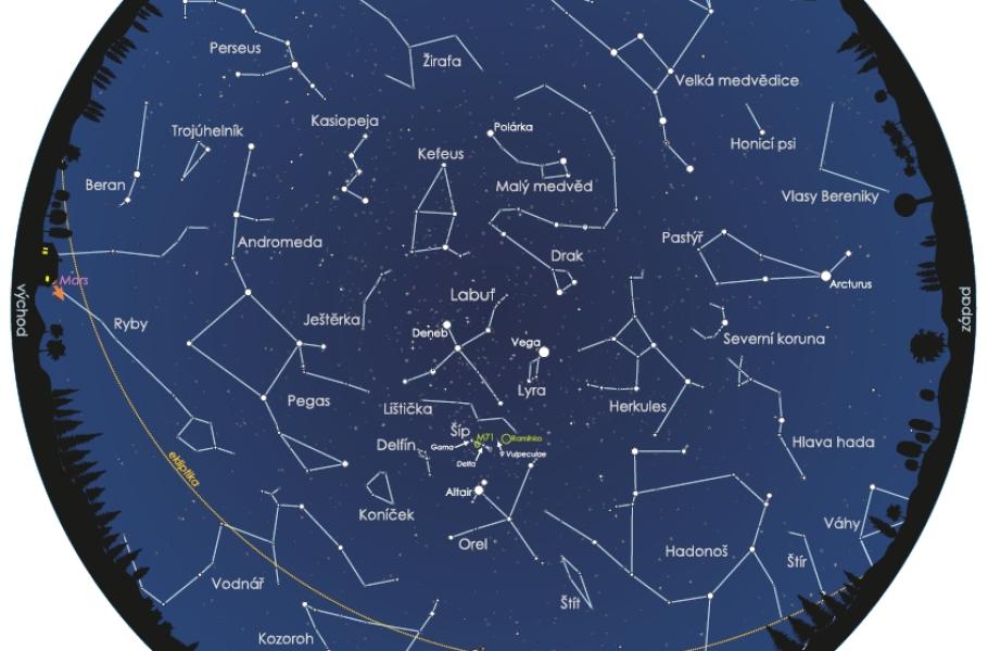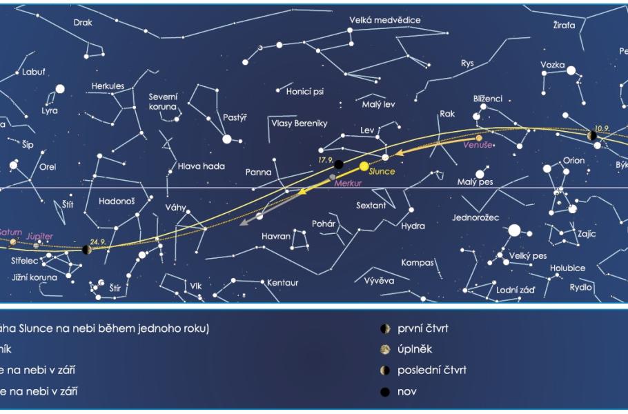 Stejně jako počasí je i zářijová večerní obloha rozkročena mezi létem a podzimem. Tu letní najdeme nad jihozápadem v podobě souhvězdí Štíra, Hadonoše či Herkula. Naopak nad jihovýchodem už nebeskou sféru brázdí podzimní Pegas s princeznou Andromedou.
