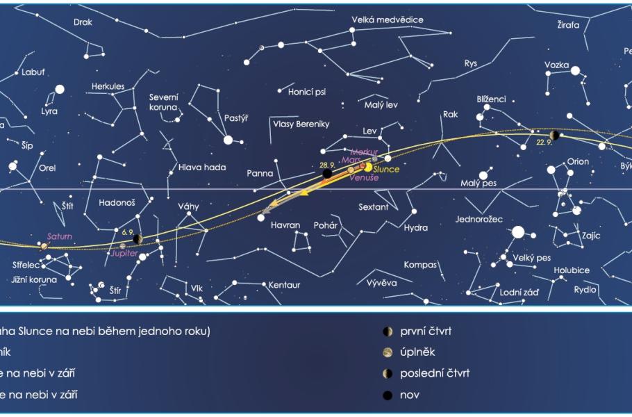 Důvod, proč nelze na nočním nebi sledovat žádnou další jasnou oběžnici, odhalíte při pohledu do přiložené celooblohové mapy. Všechny terestrické planety – tedy Merkur, Venuše i Mars – se letos v září nacházejí v blízkosti Slunce. Nad obzor se tudíž dostávají společně s naší denní hvězdou a utápějí se v jejím intenzivním svitu.