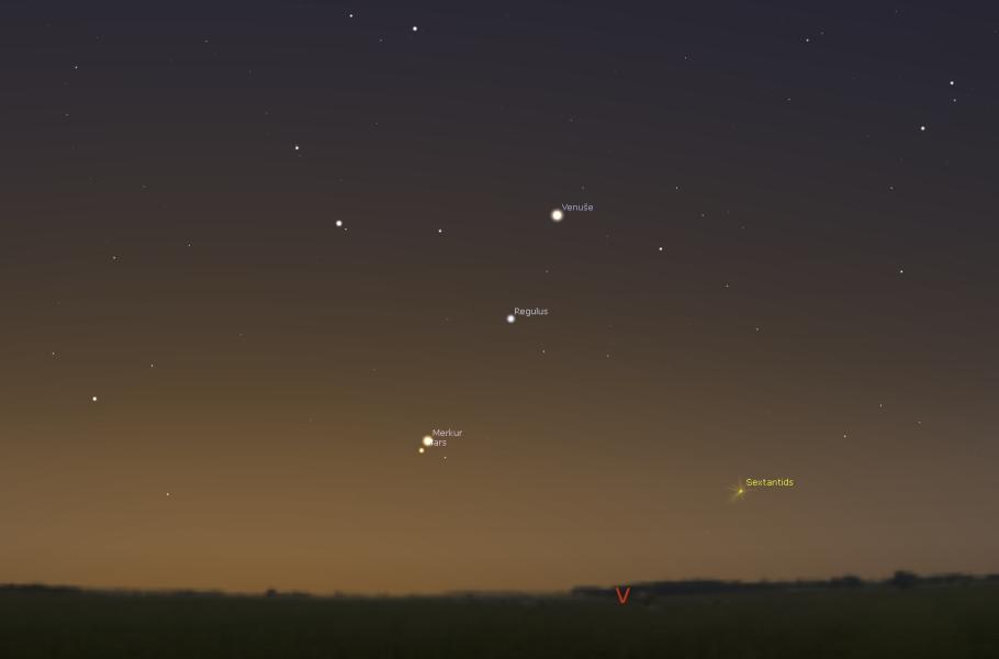 Od 16. do 20. září se přitom právě v této části ranní oblohy odehraje několik zajímavých setkání: 16. a 17. září dojde k poměrně těsnému přiblížení Merkuru a Marsu – bude je dělit úhlová vzdálenost cca 0,3°. V následujících dnech se v jejich blízkosti objeví i úzký srpek ubývajícího Měsíce a kompozici pak doplní zářivá Venuše a jasná hvězda Regulus ze souhvězdí Lva.
