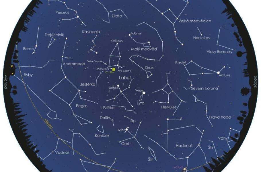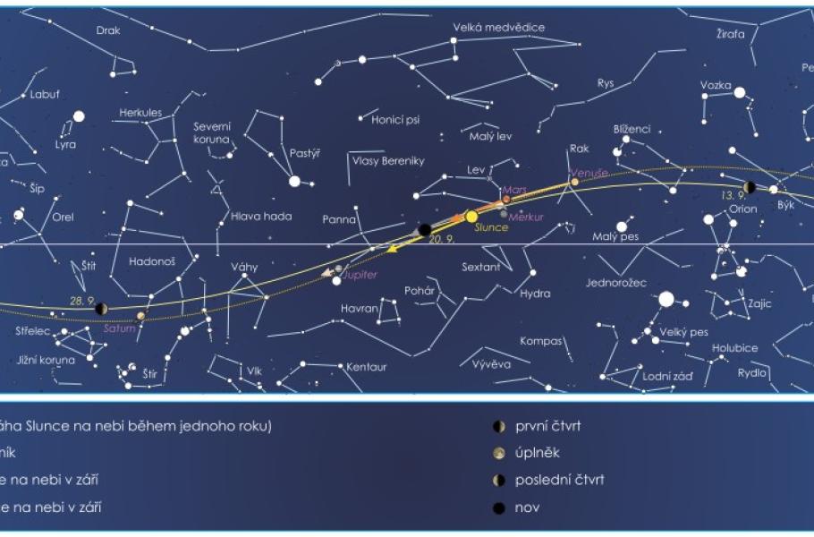 Na podvečerní zářijové obloze spatříme kromě hvězd a souhvězdí nastupujícího podzimu pouze jedinou jasnou planetu. Nažloutlý Saturn v souhvězdí Hadonoše nízko nad jihozápadem si však dlouho neužijeme – za horizontem se totiž ukryje ještě před půlnocí. Další planety přinese až ranní nebe. Jako první se nad východem zjeví výrazná Venuše a od druhé poloviny září ji budou následovat i naoranžovělý Mars a o něco méně nápadný žlutobílý Merkur.
