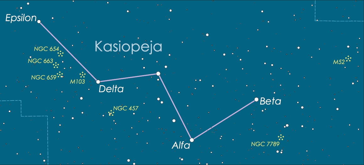 Všechny hvězdokupy z následujícího výčtu spatříte už v dalekohledu s objektivem o průměru kolem 8 cm a s 20násobným zvětšením, přičemž jasnější z nich odhalí dokonce triedr 10×50. Navíc není nijak složité je najít: Nejvýraznější stálice Kasiopeji vytvářejí na nebi charakteristické písmeno W, jehož levou část tvoří dvě hvězdy 3. velikosti, Epsilon a Delta Cassiopeiae. Načrtněte si na nebi jejich spojnici a dalekohled jednoduše namiřte mírně pod její střed. Pokud budete mít zorné pole o průměru alespoň 2°, objeví se v něm hned tři „otevřenky“ naráz.