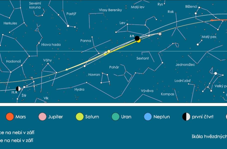 Dobře pozorovatelné však budou i planety Jupiter a Mars. Na počátku září je obě najdeme poblíž sebe v souhvězdí Býka, přičemž jako první se půl hodiny před půlnocí objeví nad severovýchodem Jupiter a Mars jej bude následovat asi s třicetiminutovým zpožděním. Až do konce září pak rozestup mezi nimi poroste, takže na sklonku měsíce už bude jejich východ dělit hodina a půl. A zatímco Jupiter setrvá v Býku, rudá planeta se již 5. září přesune do sousedních Blíženců.
