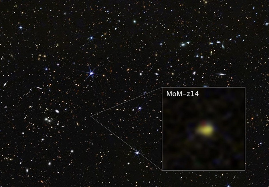 Rohan Naidu z Kavliho institutu pro astrofyziku a kosmický výzkum při Massachusettském technologické institutu se svými kolegy pozoroval galaxii MoM-z14 pomocí spektrografu NIRSpec (Near-Infrared Spectrograph) na palubě Webbova dalekohledu. Díky tomu byli schopni potvrdit, že tato galaxie má témě neuvěřitelně velký rudý posuv z=14,44.