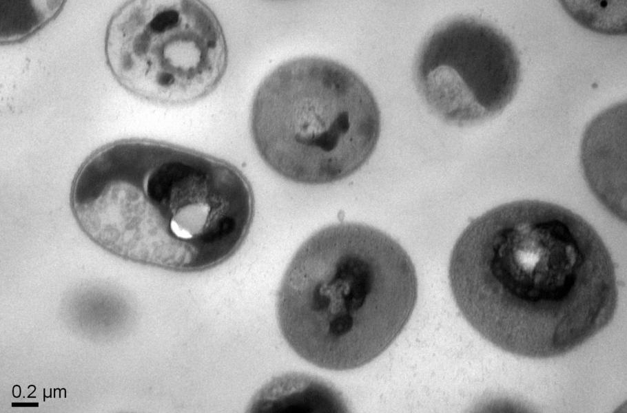 Když se nový polymer dostane do bakterie, tak její vnitřní obsah ztuhne. Na snímku buňky mrtvých bakterií, jejichž obsah zničil syntetický polymer.