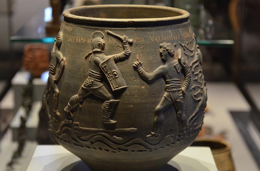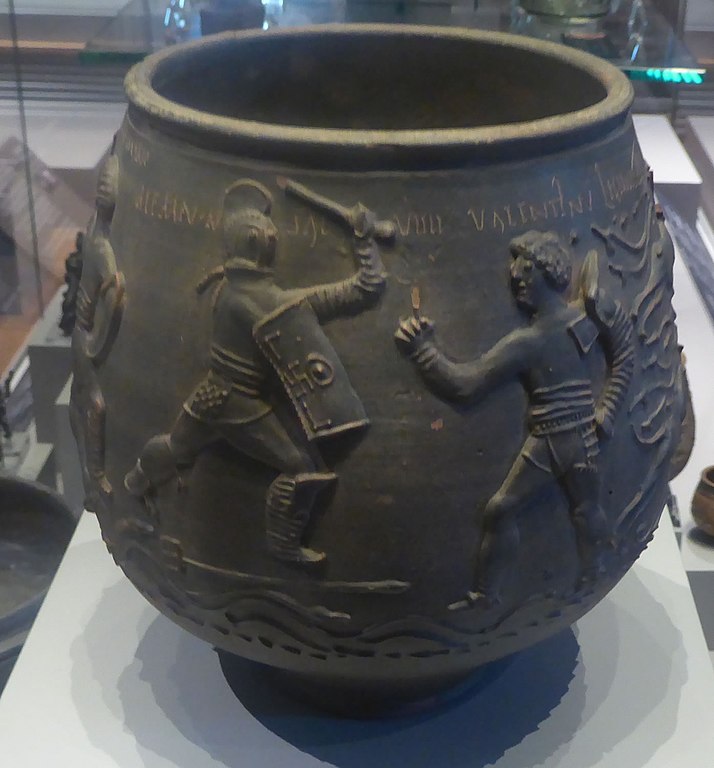 Proti původním představám se ukázalo, že slavná váza z Colchesteru s vyobrazením gladiátorů byla vyrobena z ryze britského jílu. (foto: Wikimedia Commons, Carole Raddato, CC BY-SA 2.0)