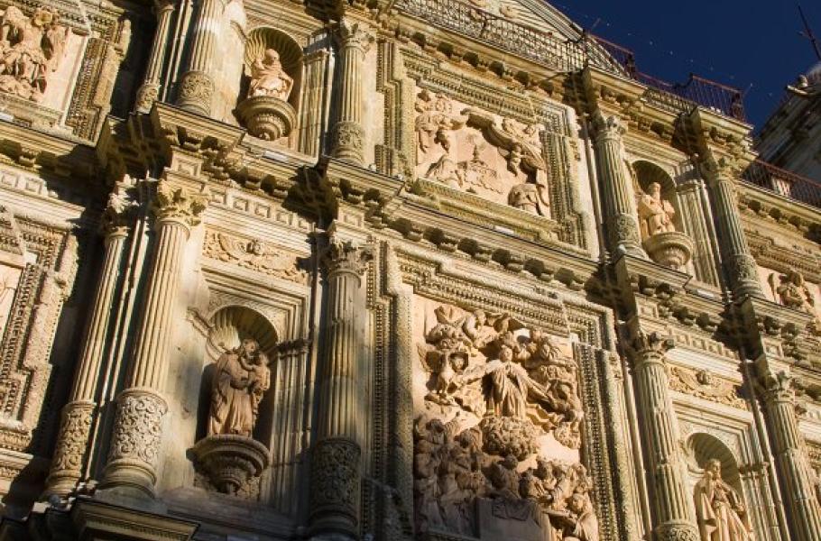 Okolo hlavního náměstí Zócala a sousední Alamedy de León vztyčili conquistadoři chrámy, mezi nimiž hraje prim městská barokní katedrála. Nejbohatší výzdobu ale skrývá kostel Santo Domingo, postavený spolu s rozsáhlým komplexem budov dominikánského kláštera na konci 16. století. Prakticky každé místo na jeho zdech i stropech pokrývají barokní plastiky, jimž vévodí pompézní rodový strom hned u hlavního vchodu. Oltář i nejzdobnější kaple dokazují, že zlatem se rozhodně nešetřilo.