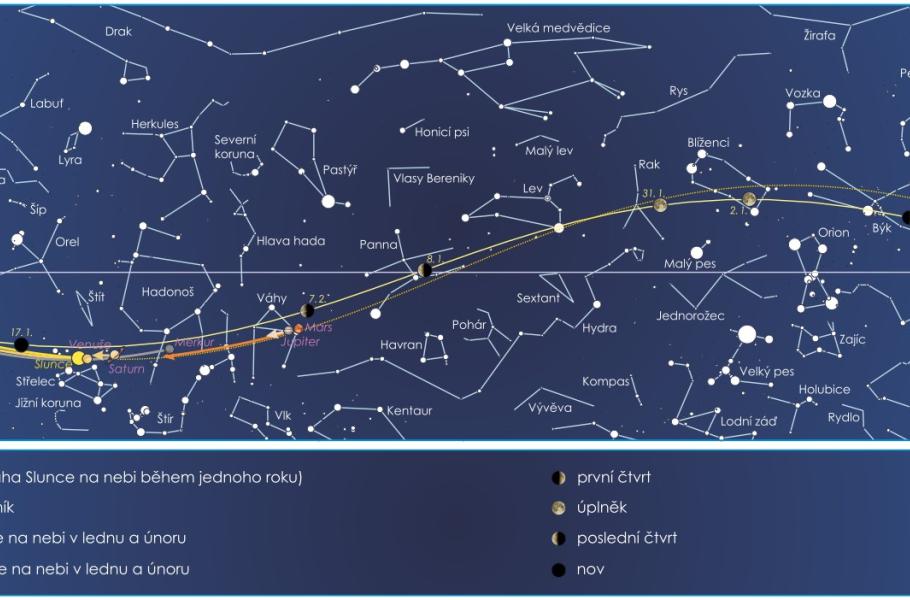 V průběhu ledna máme šanci spatřit celou řadu pohledných nebeských setkání. Vystoupí v nich Měsíc, jasné hvězdy i planety viditelné očima. Večer jsou k vidění Neptun ve Vodnáři a Uran ve východní části Ryb. Před svítáním se k sobě nad jihovýchodem přiblíží naoranžovělý Mars a žlutobílý Jupiter. Ve středu 7. ledna navíc dojde k jejich velmi těsné konjunkci. Obě planety od sebe budou jen 12 úhlových minut. Za pokročilého svítání lze pozorovat také Merkur. Venuše se v lednu nachází v těsné blízkosti Slunce, takže pro běžná pozorování bude neviditelná a neviditelný bude i Saturn.