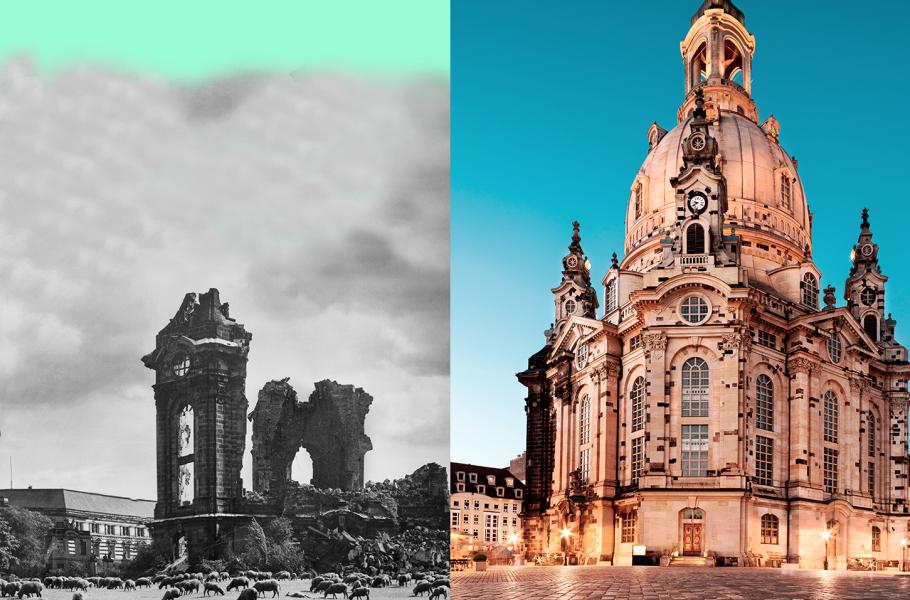 Frauenkirche neboli kostel Panny Marie v Drážďanech z 12. století byl dlouho symbolem saské metropole. Původně dřevěný svatostánek prošel přestavbou v románském, gotickém i barokním slohu, kdy jej ozdobila obdivuhodná kopule vážící 12 tisíc tun. Nepřečkal však nálet v únoru 1945. Na následujících 45 let se hromada trosek stala památníkem připomínajícím druhou světovou válku. Po roce 1989 započala rekonstrukce, jež se dnes považuje za jednu z nejkomplikovanějších v dějinách architektury. Třicátého října 2005 pak mohl být protestantský svatostánek, kde hrál na varhany i J. S. Bach, znova vysvěcen.