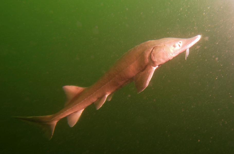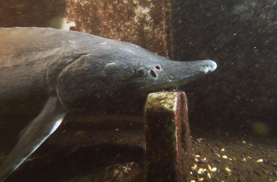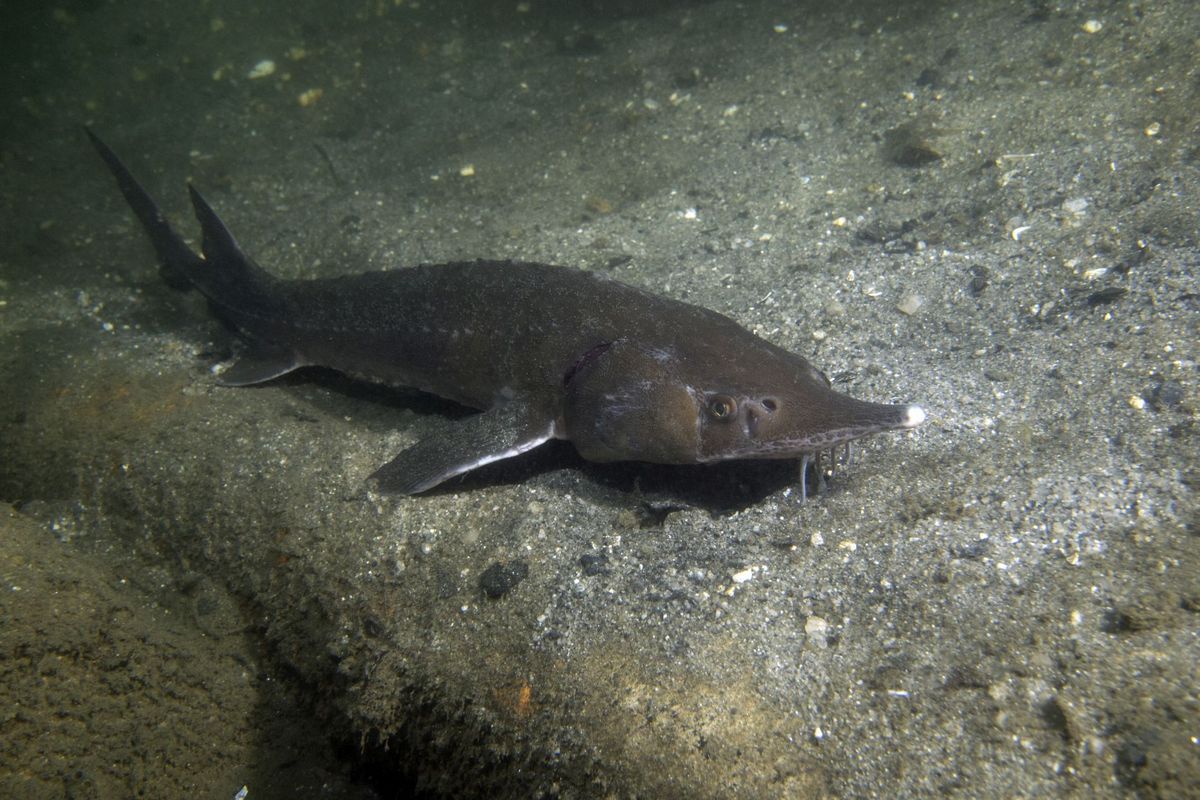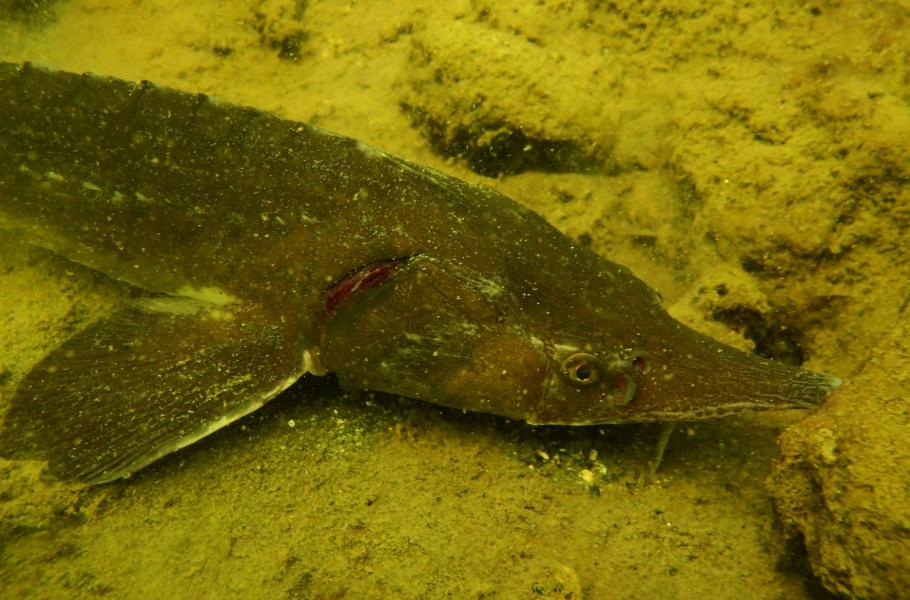 Typická poloha jesetera při odpočinku na dně lomu. Podlouhlý rypec se čtyřmi vousky je na konci typicky bíle zbarvený, stejně jako konce ploutví. (foto: © Nikita Nashipae Loxodonta)
