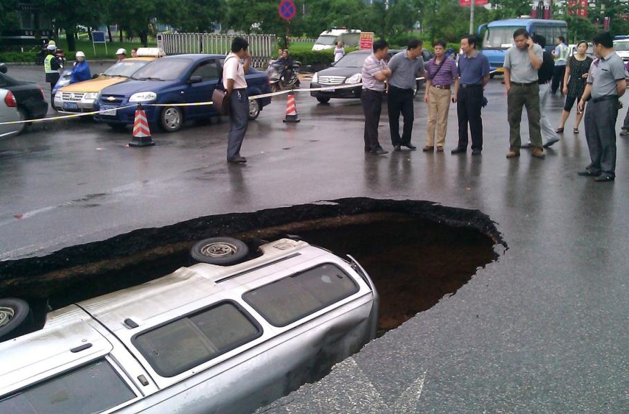 Takhle dopadl v roce 2012 řidič v Kuej-linu v čínské provincii Kuang-si. Závrt, který během jízdy pohltil jeho automobil, vznikl v důsledku podemletí krasového podloží během intenzivních dešťů.