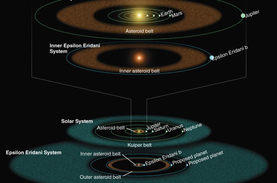 Pozorování potvrdila, že v okolí Epsilon Eridani, hvězdy o hmotnosti 0,85 Slunce, se rodí planetární systém podobný naší Sluneční soustavě. Kolem hvězdy, připomínající Slunce v rané části vývoje, jsou soustředěné dva pásy tvořené plynem, prachem a ledovým materiálem. Tyto pásy se podle vědců nápadně podobají hlavnímu pásu planetek, jak jej známe z naší Sluneční soustavy v oblasti mezi drahami Marsu a Jupitera a vnější pás, připomínající pro změnu Kuiperův pás - starý disk planetesimál obíhajících Slunce za oběžnou drahou Neptunu.