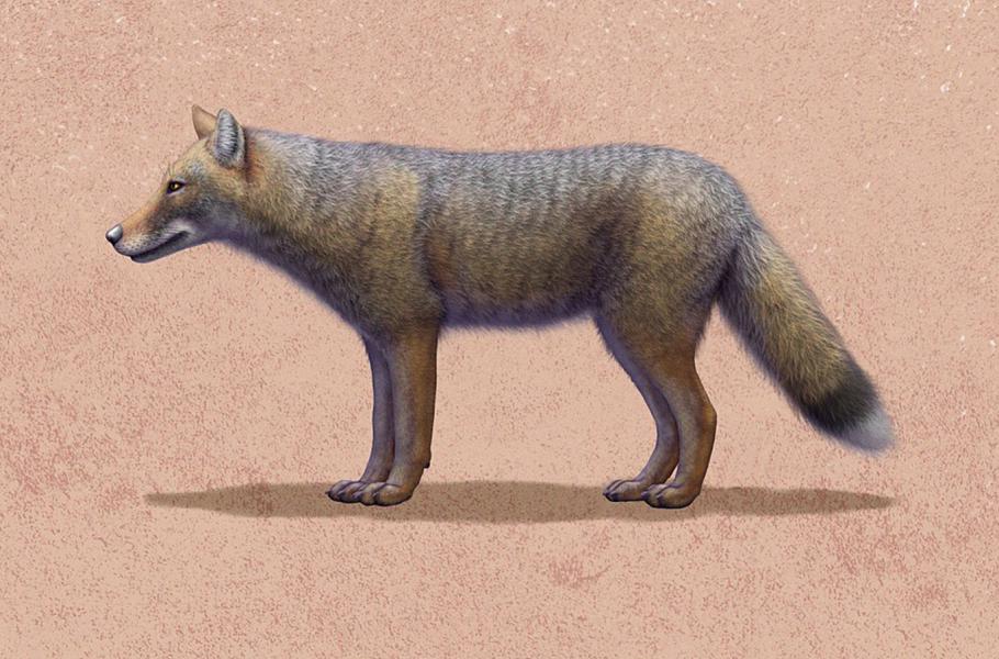 Dnes již vyhynulá jihoamerická „falešná liška“ Dusicyon avus. (ilustrace: Wikimedia Commons, Juandertal, CC BY-SA 4.0)