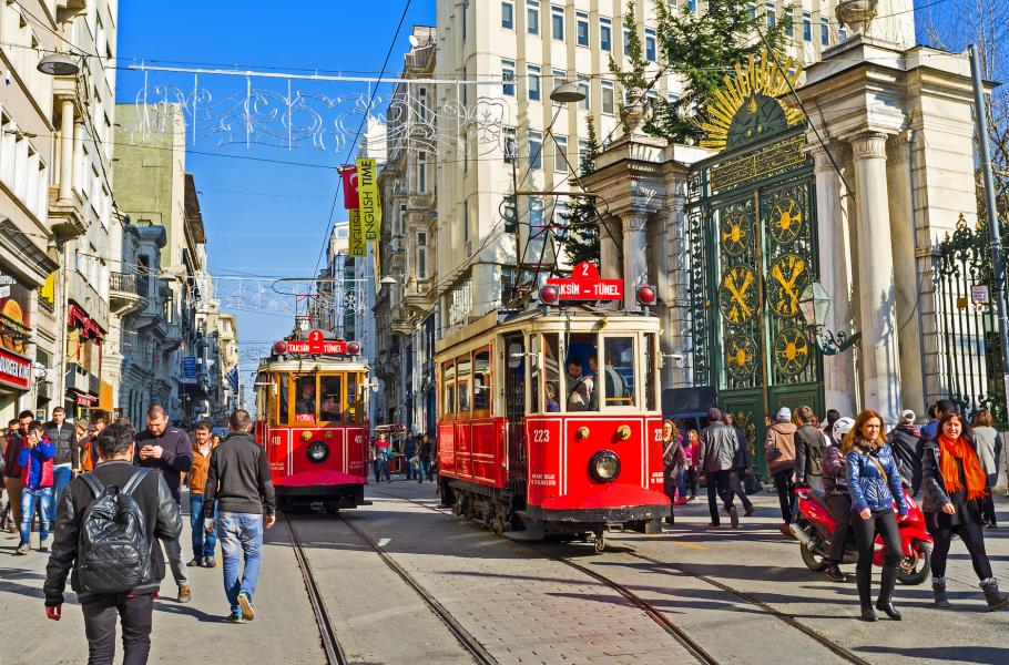 Podzemní lanovou dráhou Tünel, která má pouze dvě stanice a měří 573 m, můžete následně vyjet k nádherné městské třídě İstiklal Caddesi, secesní chloubě Istanbulu. Svezte se po ní červenou, nostalgicky vyhlížející tramvají až k náměstí Taksim. V okolí najdete krásné pasáže, pobočky známých nadnárodních obchodů, mírně předražené restaurace i skryté tradiční bufety. Objednejte si třeba tureckou delikatesu – slávky plněné rýžovou směsí či kokoreč, grilovaná ovčí střívka v bílém chlebu.