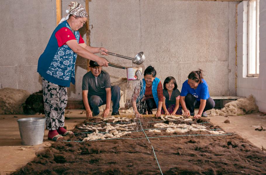 A jak se šyrdak vyrábí? Ovčí vlnu nejdřív ženy suší na slunci. Když je suchá, zabalí ji do rohoží, skáčou po ní a bijí do ní cepy. Teprve pak vlnu obarví a ručně všívají do koberců. Vyrobit jeden šyrdak trvá nejméně půl roku, zato ale vydrží i čtyřicet let.