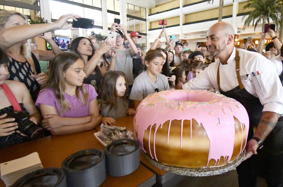 Zatímco běžné donuty se vyrábějí z kynutého těsta, obr od cukráře Jamese Smithe váží 45 kilogramů a ve skutečnosti jde o maskovaný dort. Pochutina o velikosti kola od auta vznikala několik dní, pojala by 530 běžných donutů a zasytila by zhruba stejný počet lidí. (foto: Profimedia)