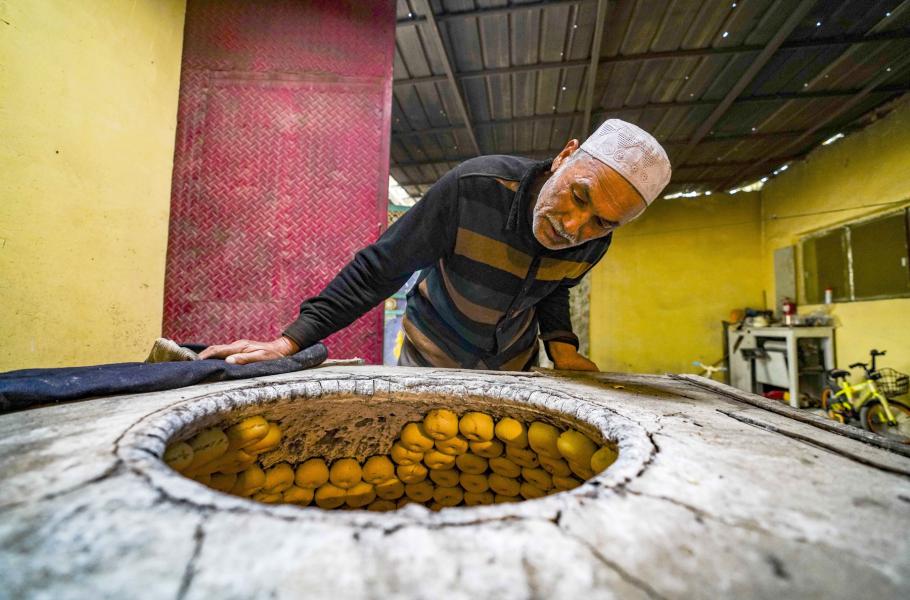 Klasický indický naan má podobu robustnější placky. Máslový naan, který si oblíbila mongolská menšina v ujgurské autonomní oblasti Sin-ťiang, však připomíná koblihu a do vypouklé pece se vkládá podél stěn. Yusup Tapuhan se pečení pochoutky věnuje již přes dvacet let a na její výrobu denně spotřebuje 50 kilogramů těsta. (foto: Profimedia)