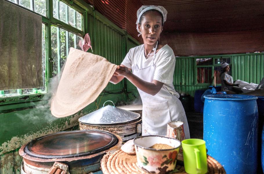 Výroba etiopské chlebové placky indžery začíná fermentací těsta, jehož základ tvoří mouka ze semen miličky habešské – obiloviny podobné prosu. Směs se nechá několik dní pracovat, načež získá charakteristicky nakyslou chuť a poté se smaží na pánvi. Výsledek je měkký a vláčný, ale zároveň dost pevný, aby se s ním dalo z misky nabírat jídlo. (foto: Profimedia)