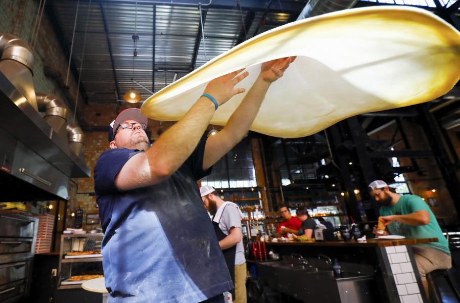 Ačkoliv se zdá, že roztáčení pizzového těsta v rukou má hlavně upoutat pozornost zákazníků, opak je pravdou. Hmota se uvedeným způsobem roztáhne, aby byla tenká uprostřed a zároveň jí zůstaly silnější okraje, které budou po upečení křupavé. Oproti strojovému zpracování se takto pizza méně vysuší a je rovněž měkčí. (foto: Profimedia)