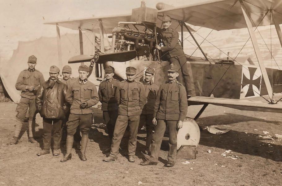 Hansa Brandenburg C.I 26.34 s odkrytým motorem Austro Daimler na letišti Brixen počátkem roku 1917. V čele mechaniků Flik 15 stojí čtvrtý zleva pravděpodobně praporčík Hans Wolfschütz – technický důstojník setniny, jenž měl na starosti zajištění provozuschopnosti letadel a jejich výzbroj i výstroj. Tento konkrétní stroj byl zničen při havárii v březnu 1917. (foto: Radim Steinke – sbírka Antonína Podhrázského (se souhlasem k publikování))