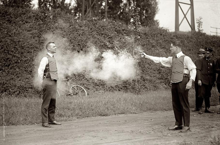 Testování účinnosti vest pro své tvůrce často znamenalo značně adrenalinový zážitek... (Washington 1923)
