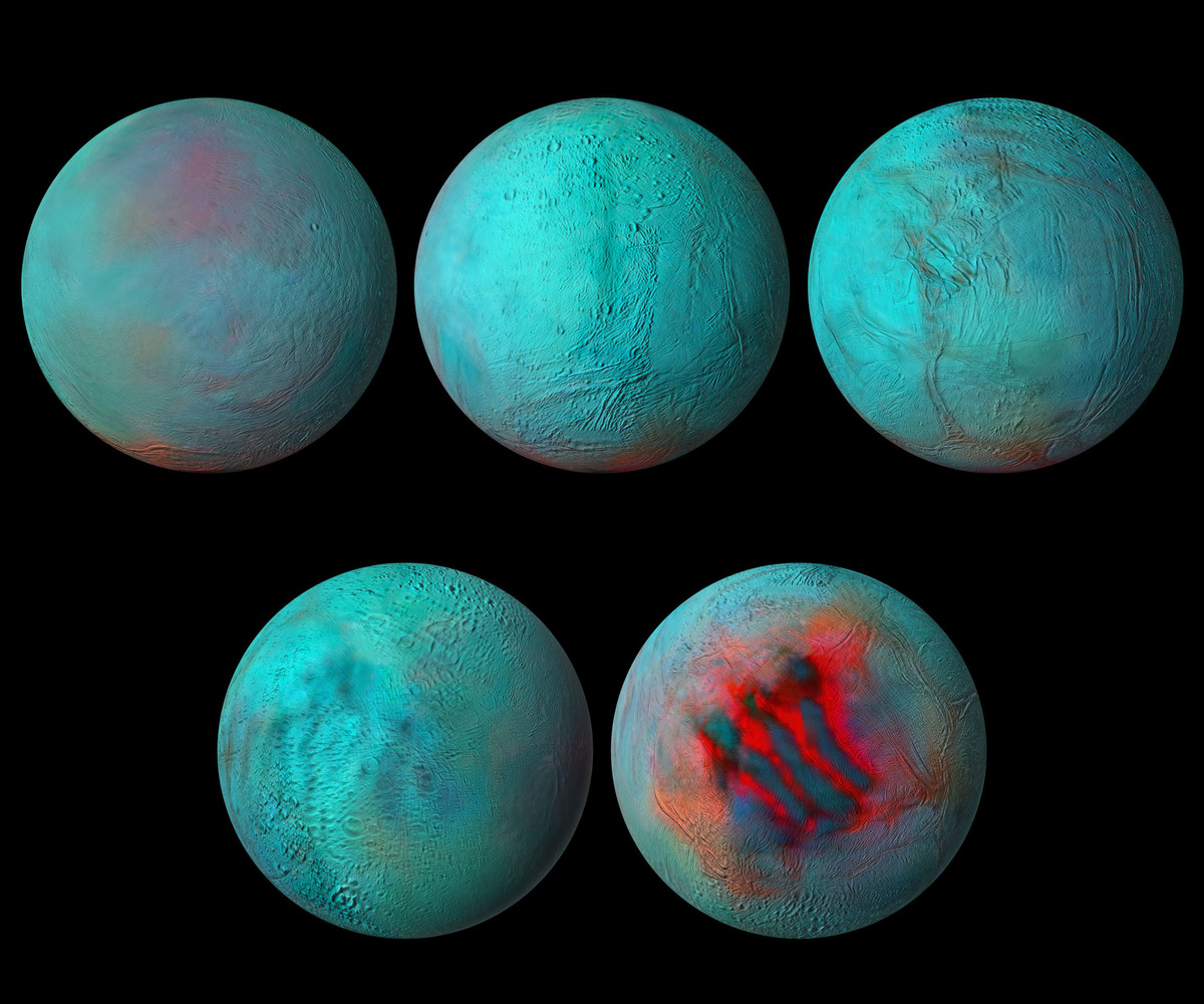 Z dat nashromážděných během několika setkání sondy s Enceladem nyní vědci vytvořili jeho detailní globální infračervenou mapu, která mimo jiné ukázala, že se na jižní polokouli u tzv. tygřích pruhů nachází geologicky mladší povrch. Část materiálu vyvrženého z gejzírů na jižním pólu totiž dopadne zpět a pokryje okolí. Uvedená skutečnost vědce nepřekvapila. Ovšem stejná spektrální data odkazující na mladý povrch se na mapě objevila také u severní hemisféry. Odborníci tak uvažují o čerstvém materiálu, který pokryl led, a o nedávné geologické aktivitě podobného typu, jaký už znají z opačné strany měsíce.