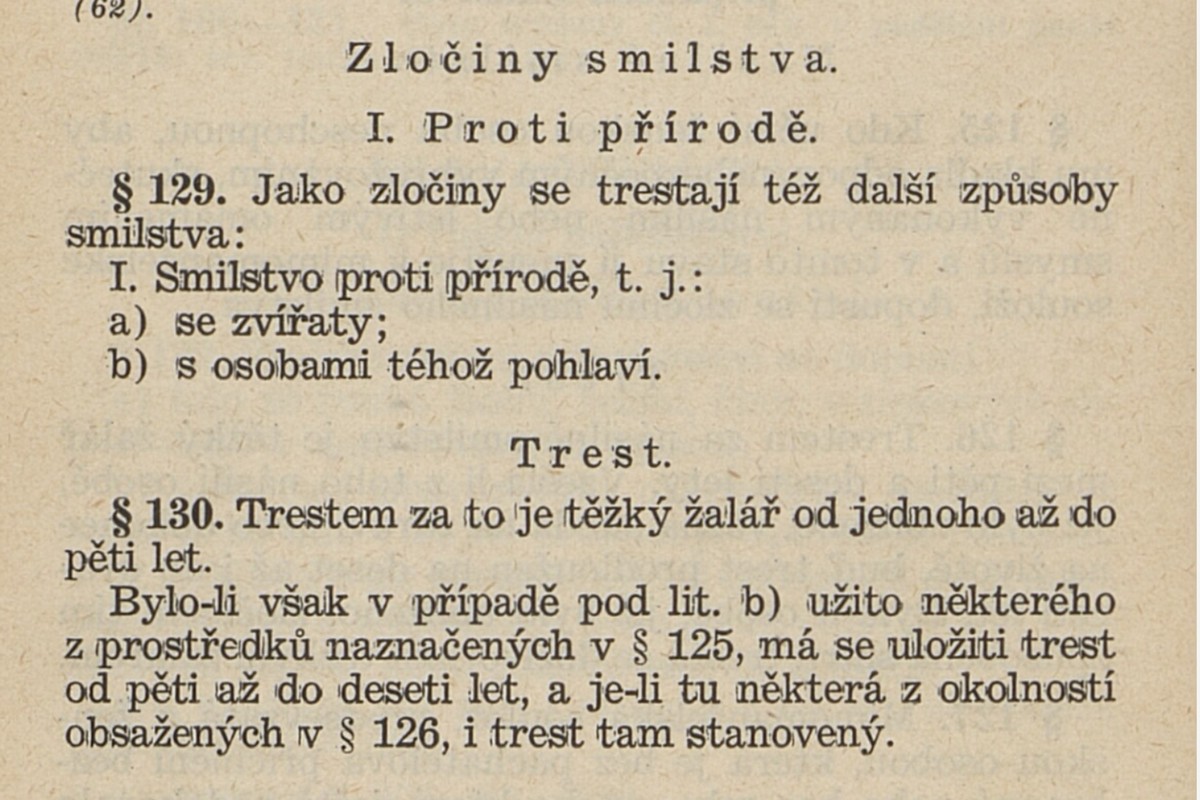 Znění paragrafu 129 b) bývalého rakouského trestního zákoníku z roku 1852 postihující homosexualitu, který převzalo i meziválečné Československo.