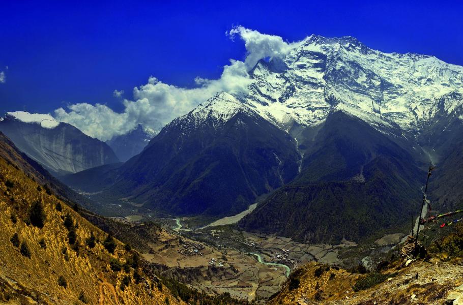 Náš sestup do Pisangu byl ukázkový a odpoledne, po šesti hodinách chůze, si užívám horké sprchy v Pisangu. V podvečer s překvapením zjišťuji, kolik mám energie, když s nosičem Chayntou vystupuji na přilehlý kopec asi do 4 000 metrů a v posledním světle fotím Pisang Peak. Dole se nádherně klikatí koryto řeky Marsyangi a napravo je vidět i obrovské sněhové pole Swargadwari Danda. Nad hlavou mám Annapurnu II a kompletní masiv všech Annapuren.