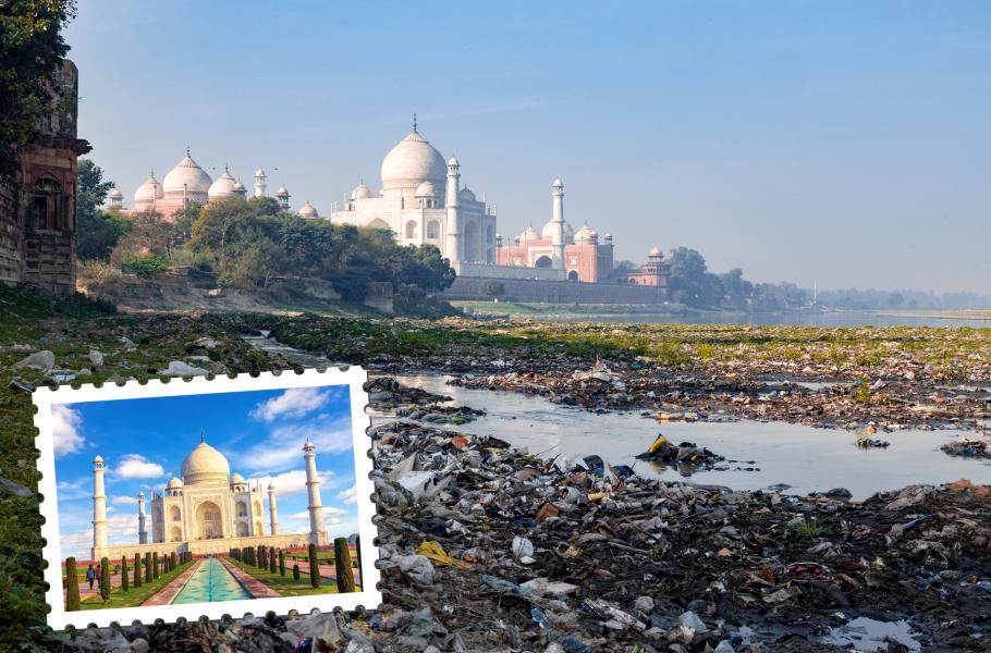Tádž Mahal mnozí považují za symbol Indie a jeho krása každý rok přivábí na deset milionů lidí. Zatímco fotografie z udržovaných zahrad a od zrcadlových bazénů vykreslují památku v nejlepším světle, stačí se vydat kousek stranou, a hned ji orámují všudypřítomné odpadky – připomínka faktu, že se v Indii takřka nerecykluje a 70 % plastů tam končí na skládkách či pohozených v přírodě. (foto: Shutterstock)