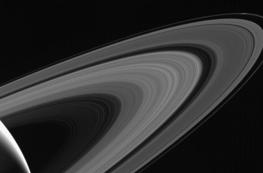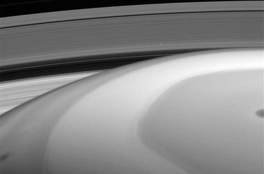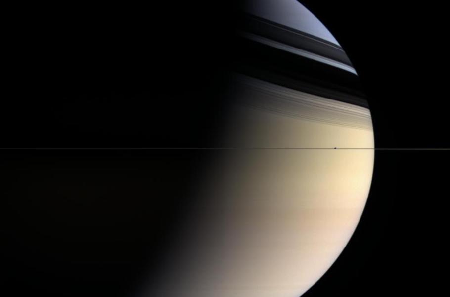 Tento snímek pořídila v březnu 2006 sonda Cassini a majestátní prstence Saturnu se na něm jeví jen jako pouhá čára. Severní polokoule Saturnu je namodralá, a sice ze stejného důvodu, proč se jeví modrá pozemská obloha. Molekuly v bezmračných částech atmosfér obou planet lépe rozptylují modré světlo než červené. Ve větší hloubce pak už začíná převládat barva zlatavá.