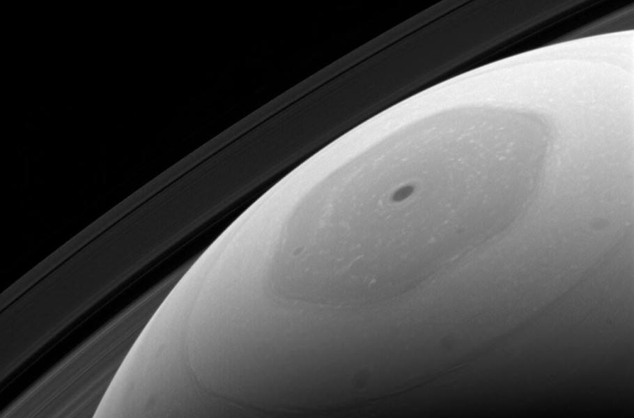 Na konci dubna Cassini úspěšně proletěla mezi Saturnem a jeho prstenci. Na snímku pořízeném pár hodin před nejtěsnějším přiblížením je vidět Saturnův neobvyklý severní hexagon kolem severního pólu.