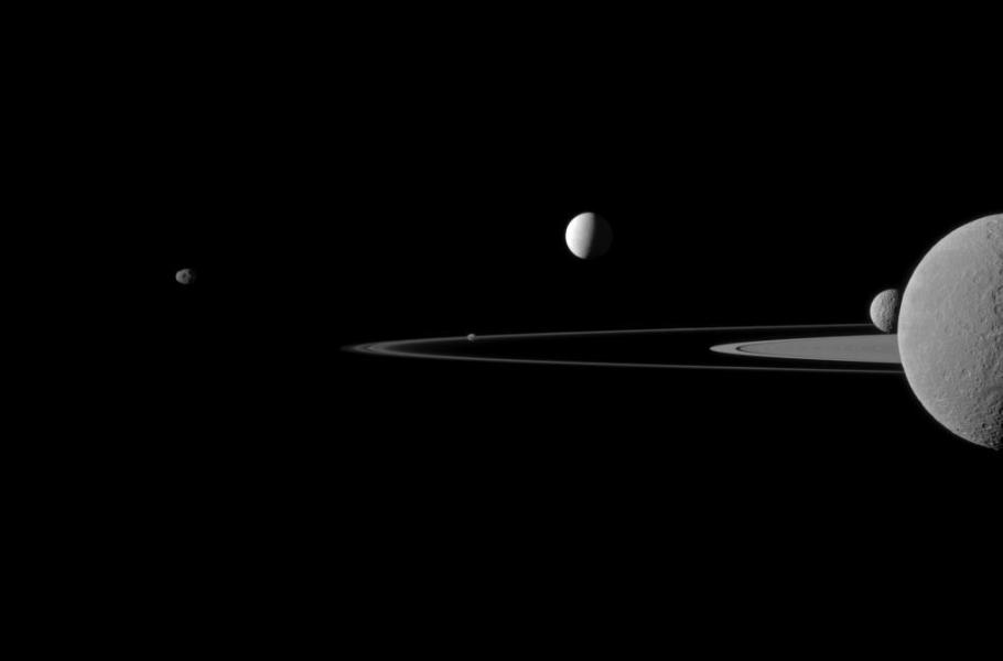 Tento nádherný snímek z 29. července 2011 zachycuje pět z 53 potvrzených měsíců Saturnu. Zleva: Janus, Pandora, Enceladus, Mimas a Rhea.