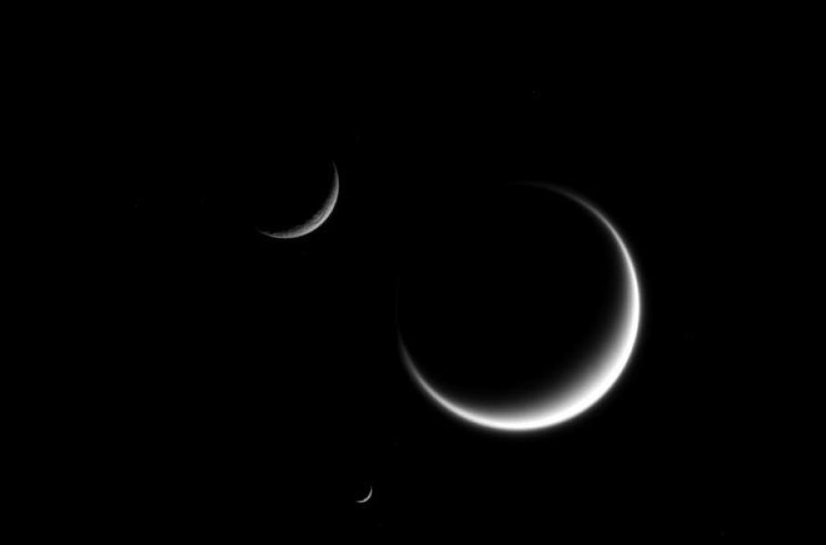 Zatímco na Zemi se můžeme pokochat pohledem pouze na jeden měsíc, pohled ze Saturnu nabízí v tomto směru mnohem pestřejší podívanou, třeba takovou, jaká se nabídla Cassini 25. března 2015. Na snímku Titan, Mimas a Rhea.