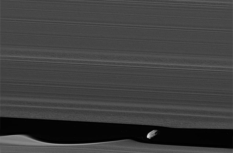 Daphnis je jeden z vnitřních měsíců Saturnu. Měsíček s průměrem 6 až 8 kilometrů objevila Cassini 6. května 2005. Na své cestě kolem planety se Daphnis pohybuje ve zvlněné trajektorii, která se v průběhu času mění zhruba o 17 kilometrů. Snímek sonda pořídila 16. ledna 2017 ze vzdálenosti 28 000 km.