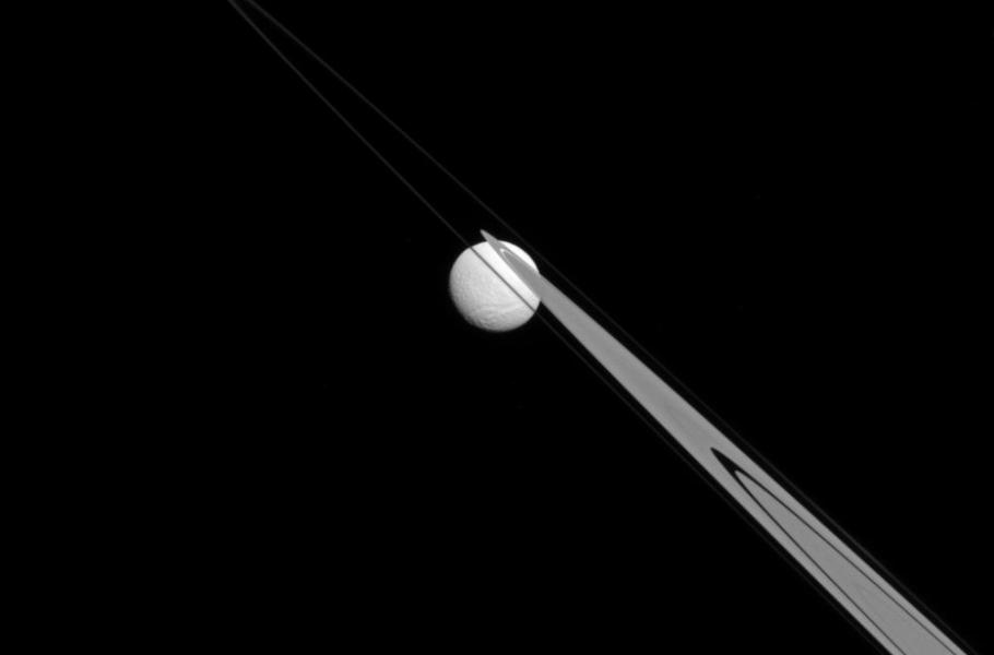 Tento úchvatný snímek měsíce Tethys pořídila sonda Cassini ze vzdálenosti 1,8 milionu kilometrů. Tethys je jedním ze Saturnových měsíců nacházející se v Keelerově mezeře, tedy mezikruží prstence A a F a kolem Saturnu obkrouží jednou za necelé dva dny.