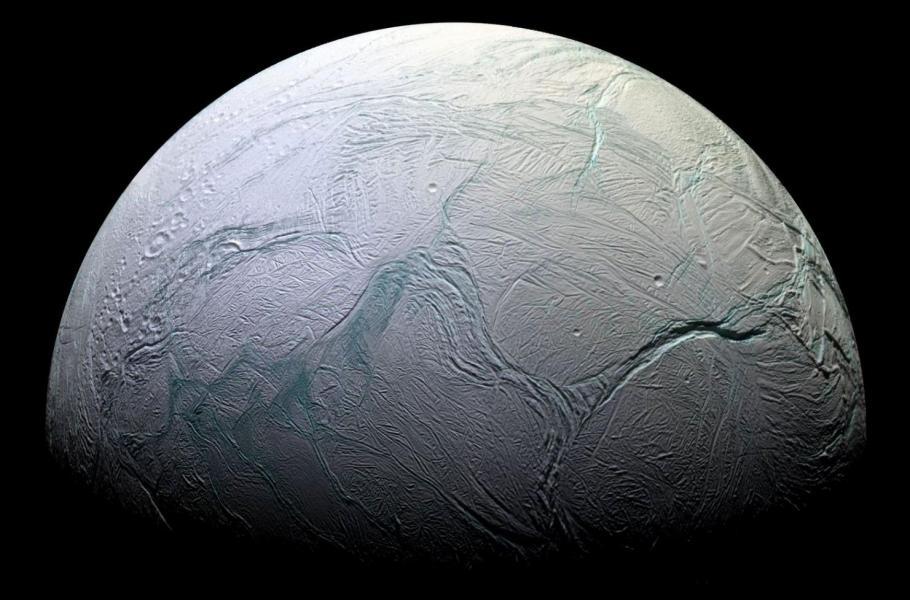 K vytvoření tohoto obrazu Saturnova měsíce Enceladu bylo zapotřebí 28 samostatných fotografií pořízených sondou Cassini. Detailní pohled odhaluje zřetelné tektonické lomy, které naznačují, že na Enceladu v minulosti k velkým posunům obrovských ledových ploch.
