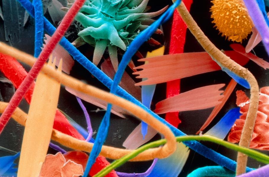 Na tomto snímku z rastrovacího elektronového mikroskopu je vidět vzorek běžného domácího prachu, jenž obsahuje nejrůznější materiály. Mezi zde zachycenými alergeny jsou dlouhé vlásky kočičí srsti, syntetická i vlněná vlákna, vroubkovaná hmyzí křídla, zrnko pylu a zbytky rostlin.