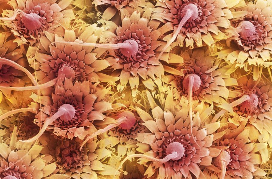 I tito nevítaní vetřelci se pod elektronovým mikroskopem jeví mnohem sympatičtěji než ve skutečnosti. Snímek ukazuje stvol kuřecího pera, na nějž jsou přilepena vajíčka takzvaných kuřecích vší z rodu Menoponidae. Vajíčka jsou nezvyklá především svou ornamentální krásou. Každé z nich je tvořeno stopkou opatřenou čepičkou (růžové části), z níž později vylézá larva. Květiny připomínající plátky jsou rovněž součástí vajíček.