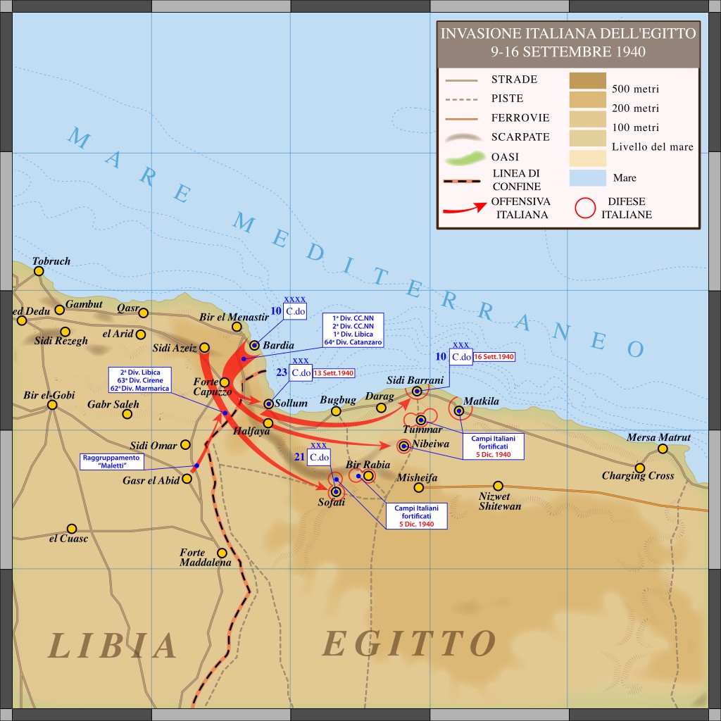 Invazi do Egypta měly provést jednotky 10. armády pod velením generála Maria Bertiho, který mohl počítat s deseti divizemi a podpůrnými jednotkami. Brzy se však ukázalo, že rozhodně nepůjde o bleskovou válku v německém stylu. Italské nákladní automobily trpěly vysokou poruchovostí, což zdržovalo přesuny větších jednotek. První akce také jasně potvrdily, že předchozí výcvik vojáků, stejně jako bojová morálka, byl mizerný. Podobně na tom Italové byli i s výzbrojí, zastaralou a někdy dokonce nefunkční.