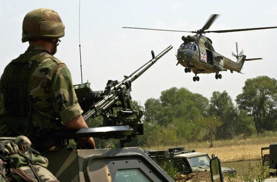 Francouzský voják v lehkém čtyřkolovém obrněnci Panhard VBL Mk2 s lafetovaným 7,62mm kulometem AA-52 sleduje vrtulník Aérospatiale SA 330 Puma s britskou osádkou, přistávající 27. srpna 2001 u makedonské vesnice Otlja. (foto: Profimedia)
