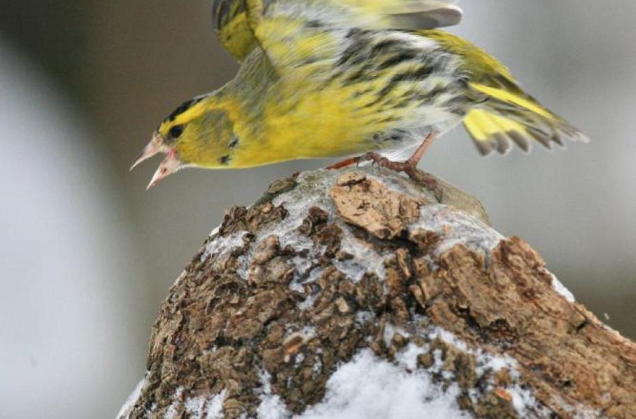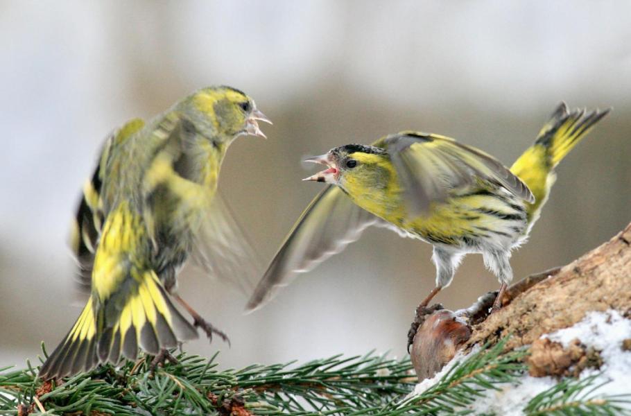 Čížci lesní (Carduelis spinus) jsou drobní ptáci létající převážně v hejnu. U krmítek jsou velice živí, hašteřiví, někdy až agresivní. Neustále napadají další ptáky, neváhají se obořit na větší druhy jako sýkory koňadry nebo zvonky zelené. Tento snímek zachycuje vyřizování účtů mezi dvěma čížky
