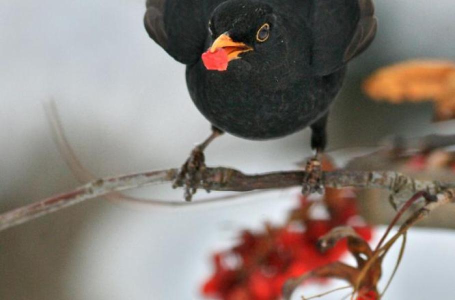 Kos černý (Turdus merula) je běžný obyvatel zahrad, parků a lesů. Zimní období dává vyniknout jeho jinak nenápadné eleganci