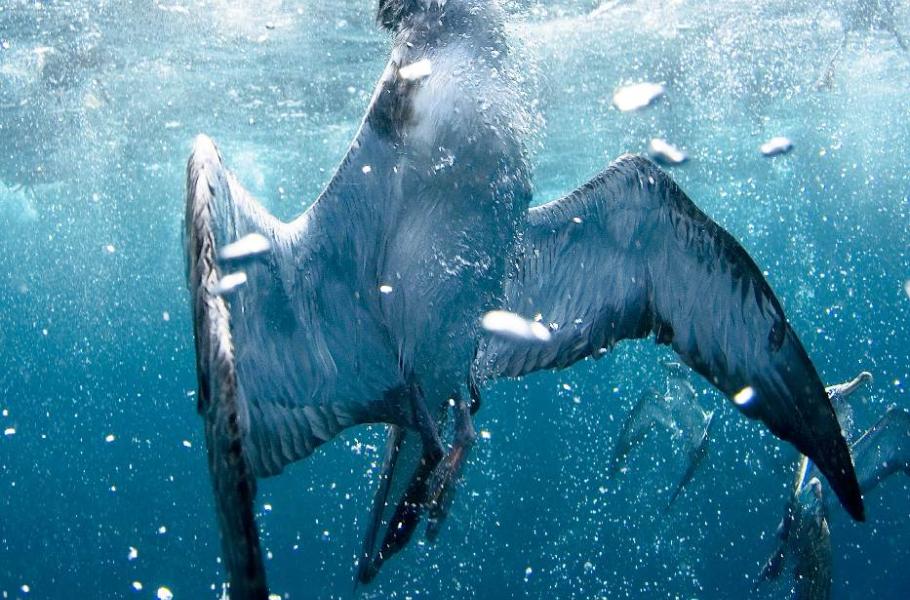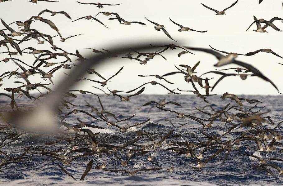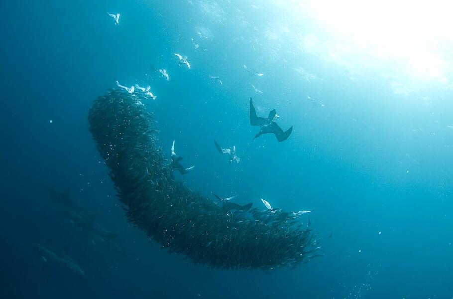 Daleko na otevřeném oceánu, kde je podmořský život rozptýlen do obrovských hloubek a ploch, jsou početná hejna ryb vzácností. Proto se stává, že mořští savci a velké predátorské ryby shromáždí obrovské množství malých rybek do nahuštěné koule, z níž si pak delfíni berou jednu rybu za druhou. Hostiny se často účastní tuňáci, někdy i velryby, zejména plejtváci. Ovšem hlavním strávníkem, jenž si nenechá ujít žádný oceánský banket, je buřňák šedý (Calonectris diomedea). Tito na první pohled nenápadní ptáci jsou mistry v potápění a vidět je pod vodou při lovu patří k nejúžasnějším zážitkům, které lze v oceánu zažít.