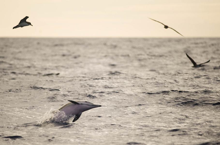 Delfíni obecní opouštějí zbytek ''bait ballu'' ve tvaru fazole a přenechávají ho buřňákům